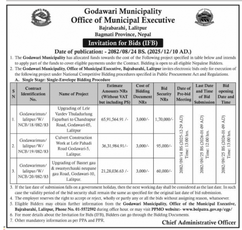 गोदावरी नगरपालिका-११, ललितपुरमा स्थित चापागाउँ तरकारी बजारमा भाडामा लिन सकिने पसल र सार्वजनिक शौचालय निर्माण कार्यका लागि रु ७,८०९,२०५.८३/- रकमको बोलपत्र स्वीकृत गर्ने आशयको सूचना।