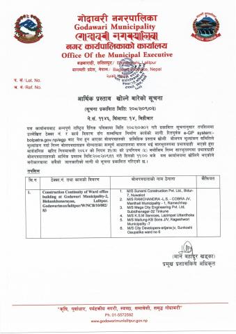 गोदावरी नगरपालिका अन्तर्गत वडा नं २, बिशंखुनारायणस्थित वडा कार्यालय भवन निर्माण कार्यको निरन्तरता सम्बन्धी आर्थिक प्रस्ताव खोल्ने बारेको सूचना।