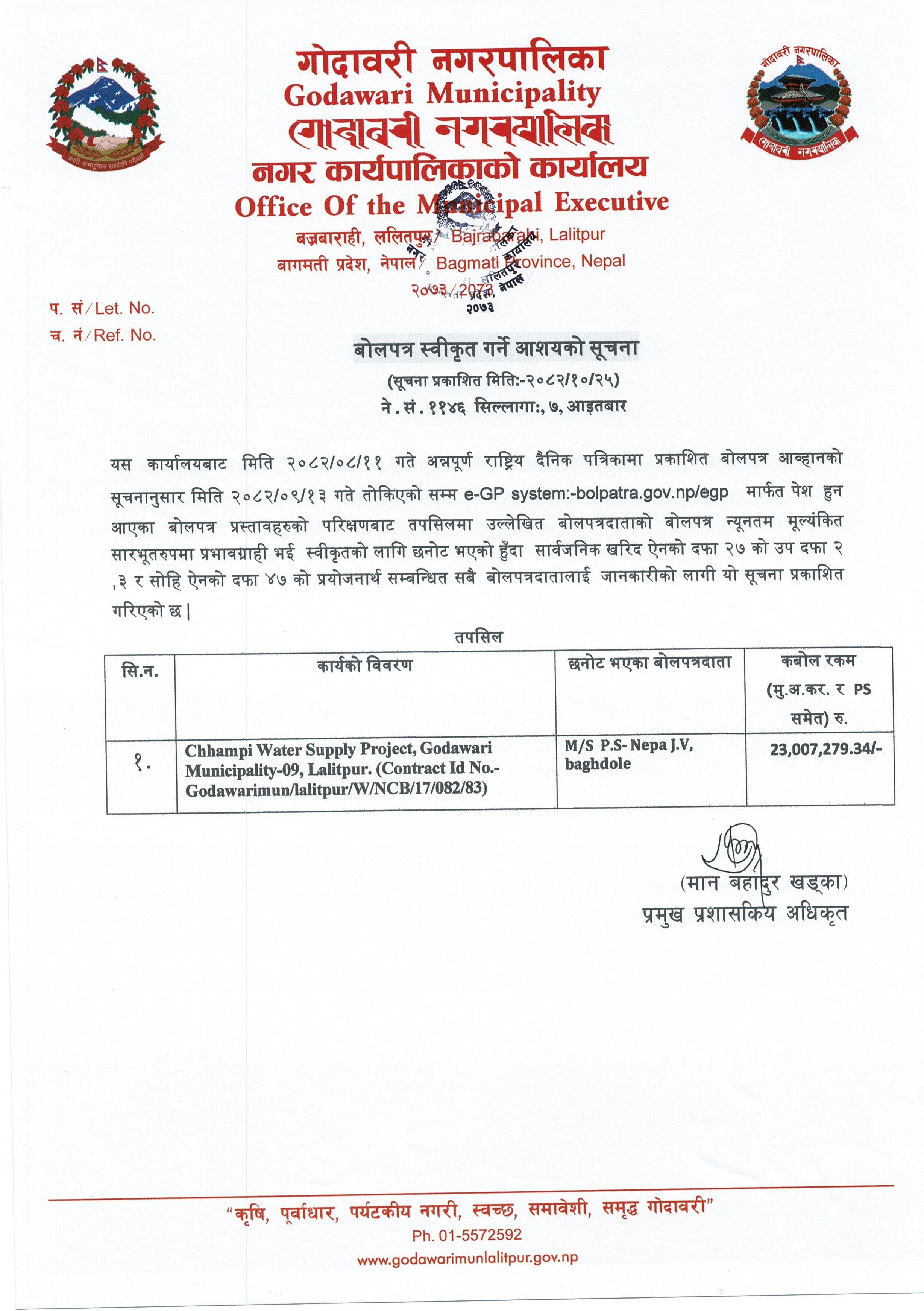 गोदावरी नगरपालिका वडा नं.०९, ललितपुरस्थित छाँपी खानेपानी आयोजना कार्य सम्बन्धी बोलपत्र स्वीकृत गर्ने आशयको सूचना।