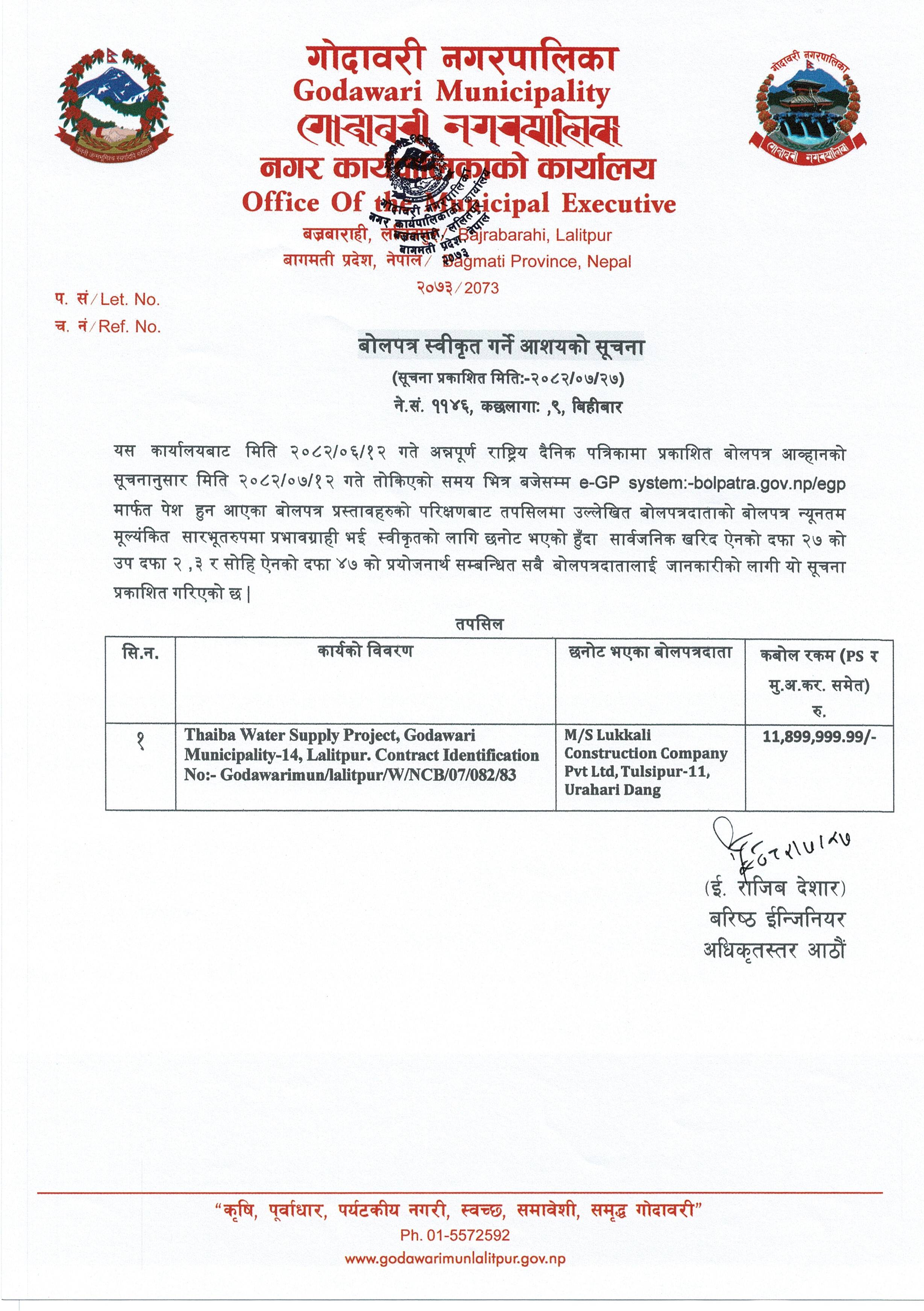 ठैब खानेपानी आपूर्ति परियोजना, गोदावरी नगरपालिका–१४, ललितपुरका लागि कबोल रकम(PS र मु.अ.कर समेतण रु.१,१८,९९,९९९.९९/- को बोलपत्र स्वीकृत गर्ने आशयको सूचना।