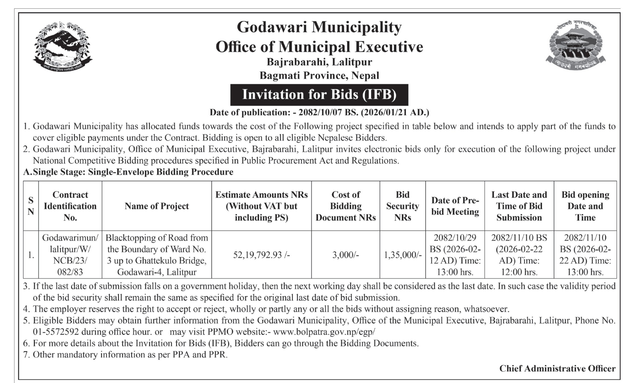 गोदावरी नगरपालिका वडा नं १०, ललितपुरस्थित बस्नेटगाउँ तथा स्वास्थ्यचौकी,नेउपानेगाउँ सडक स्तरोन्नति सम्बन्धी बोलपत्र स्वीकृत गर्ने आशयको सूचना।