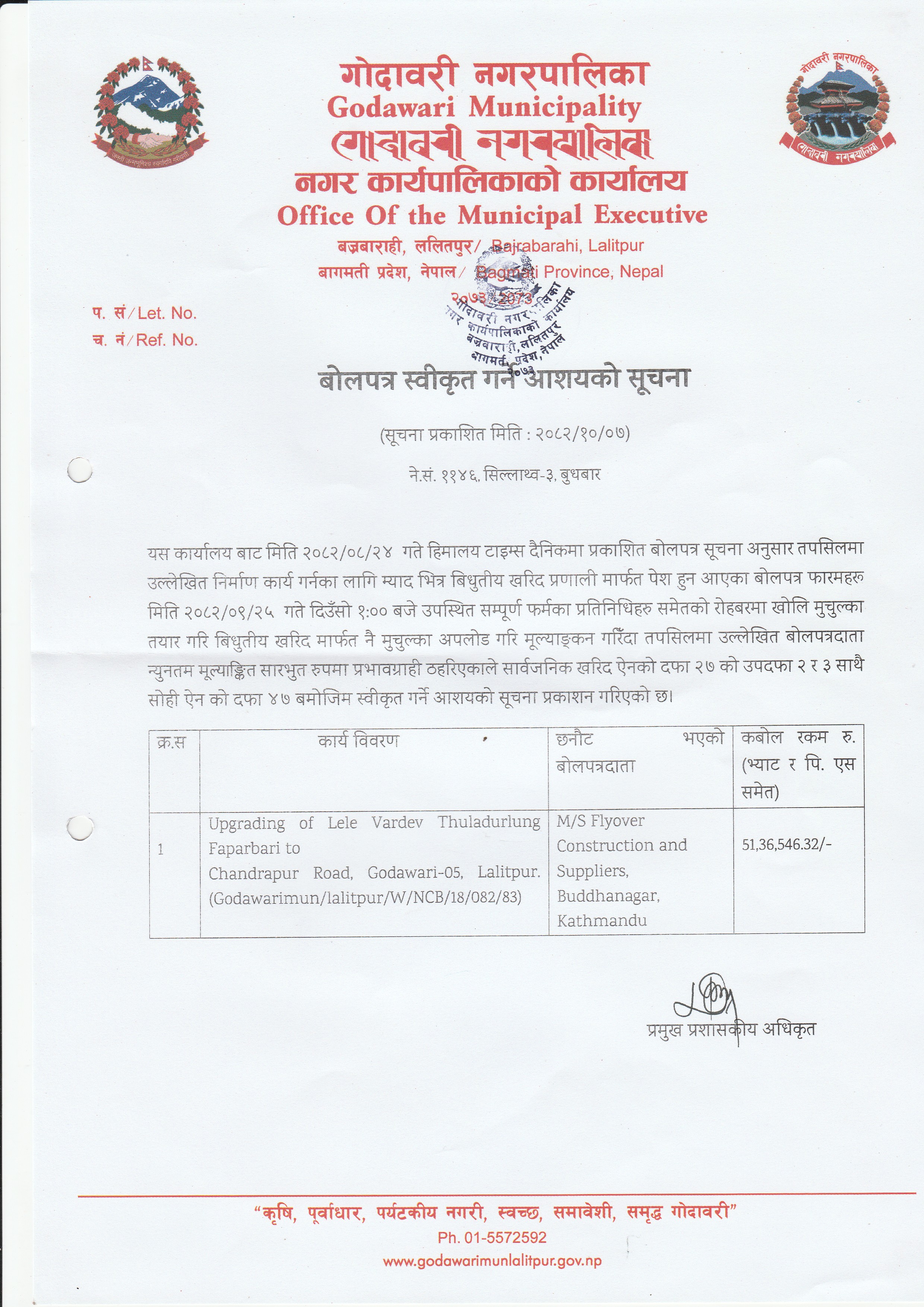 गोदावरी नगरपालिका वडा नं १०, ललितपुरस्थित बस्नेटगाउँ तथा स्वास्थ्यचौकी,नेउपानेगाउँ सडक स्तरोन्नति सम्बन्धी बोलपत्र स्वीकृत गर्ने आशयको सूचना।