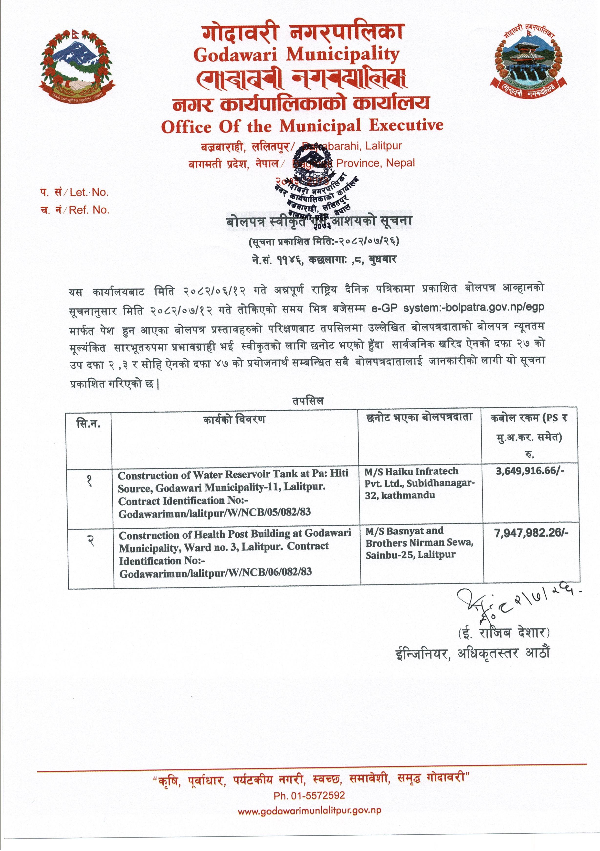 » बोलपत्र स्वीकृत गर्ने आशयको सूचना