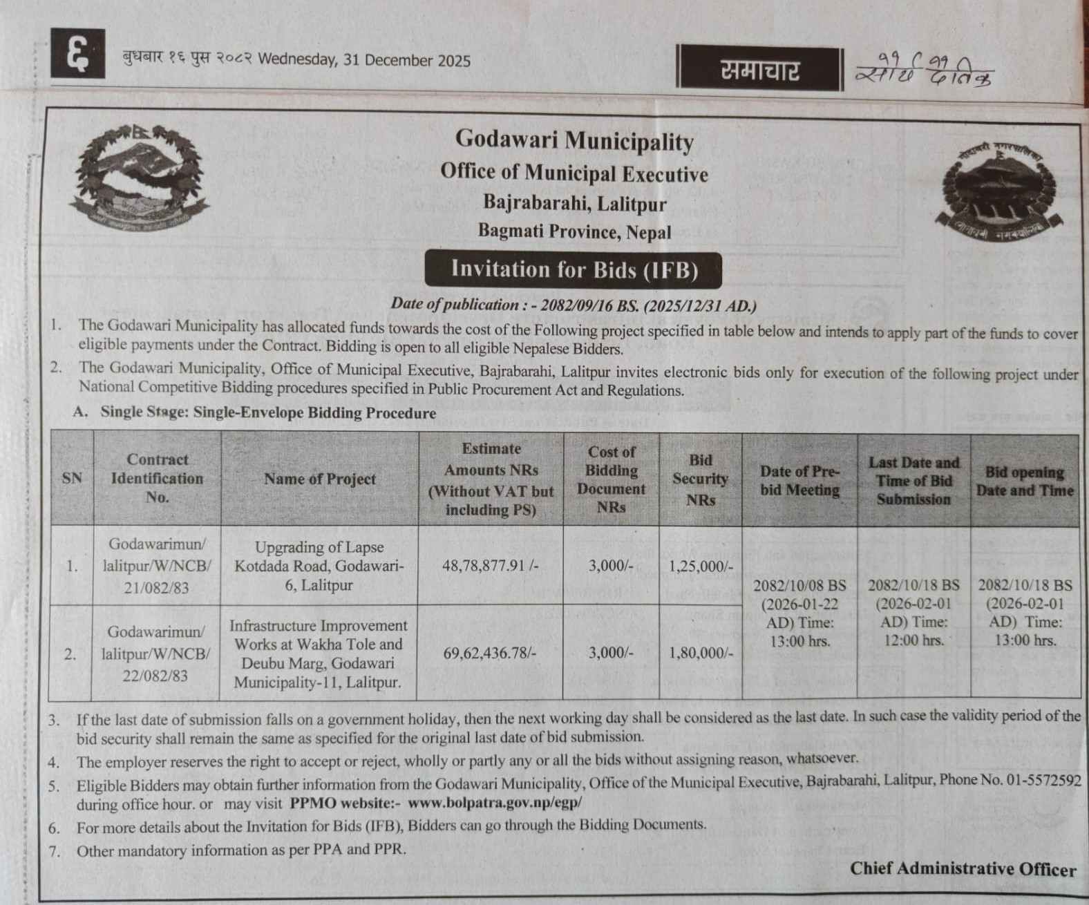गोदावरी नगरपालिका अन्तर्गत वडा नं. १२, ठेचोस्थित गोदावरी नगरपालिका अस्पतालको ब्लक–बी भवन निर्माण सम्बन्धी आर्थिक प्रस्ताव खोल्ने बारे सूचना।