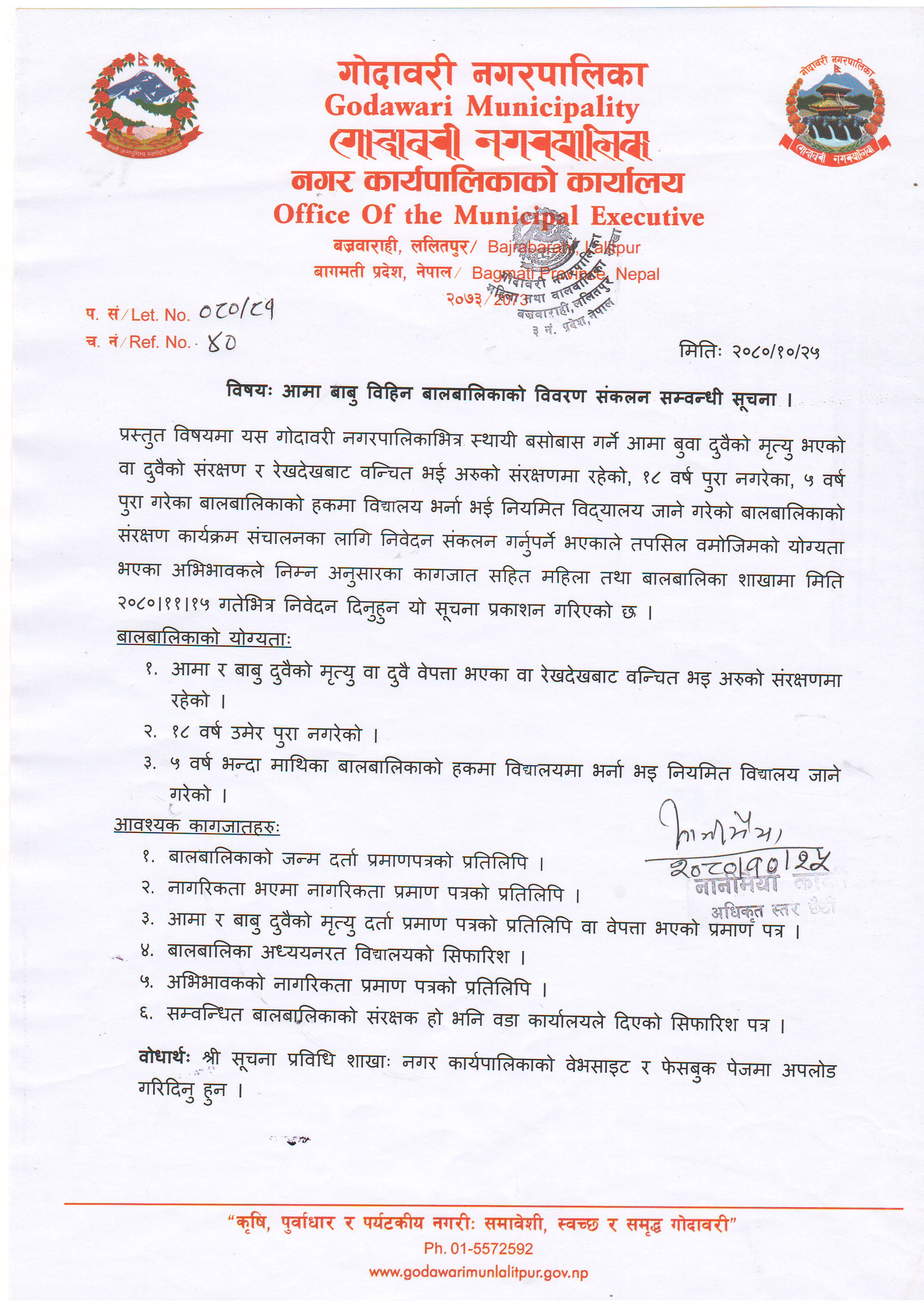 » आमा बाबु विहिन बालबालिकाको विवरण संकलन सम्बन्धी सूचना।