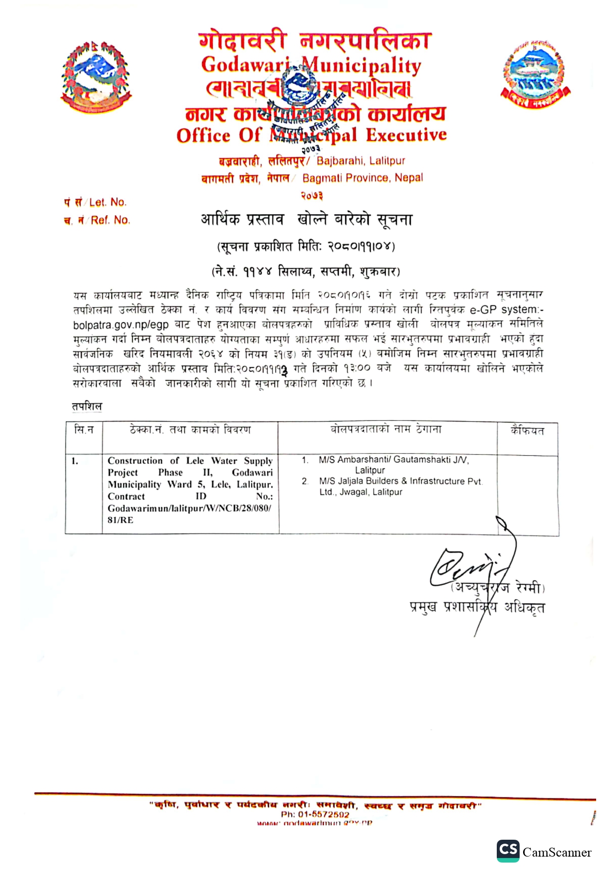 गोदावरी नगरपालिका वडा नं ११, ललितपुरमा ज्येष्ठ नागरिक दिवस सेवा भवन तथा भ्वय छेँ निर्माणका लागि लागत अनुमान रु. ९९,१५,९४५.६५।-को बोलपत्र स्वीकृत गर्ने आशयको सूचना।