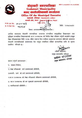 गोदावरी नगरपालिका क्षेत्र भित्रको आर्थिक वर्ष आ.व ८२/०८३ को लागि विज्ञापन कर संकलन( मु.अ. कर समेत) रु १९,३७,९५०/- सम्बन्धी बोलपत्र स्वीकृत गर्ने आशयको सूचना।