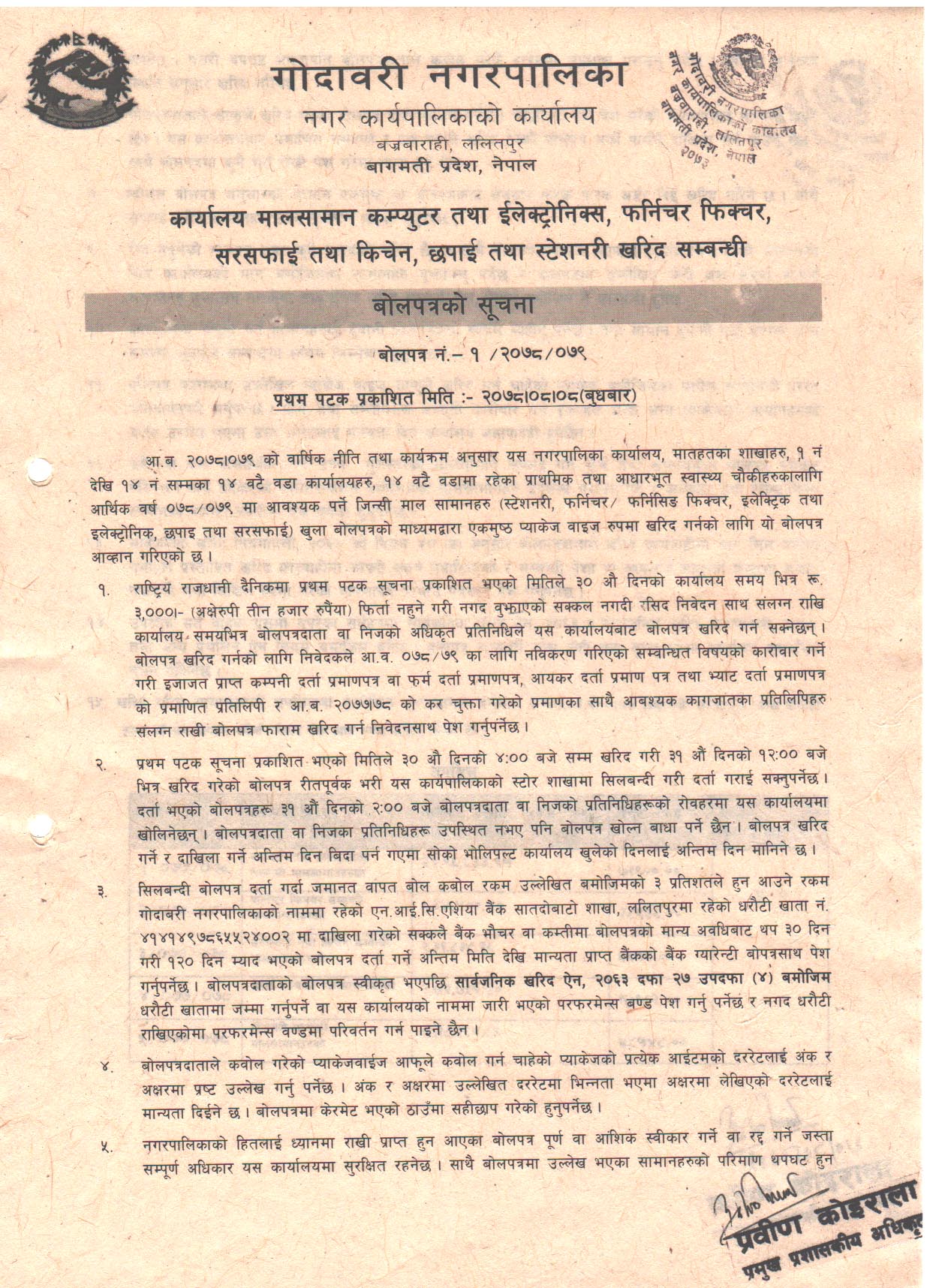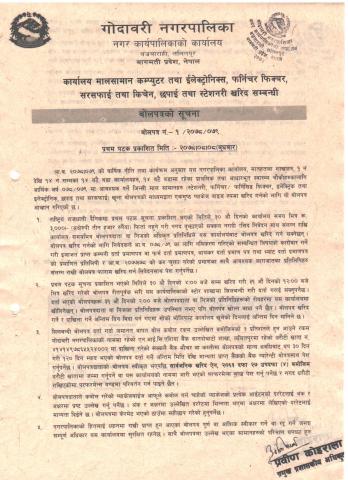 कार्यालय मालसामान कम्प्युटर तथा इलेक्ट्रोनिक्स, फर्निचर, फिक्चर, सरसफाइ तथा किचेन, छपाई तथा स्टेशनरी खरिद सम्बन्धमा