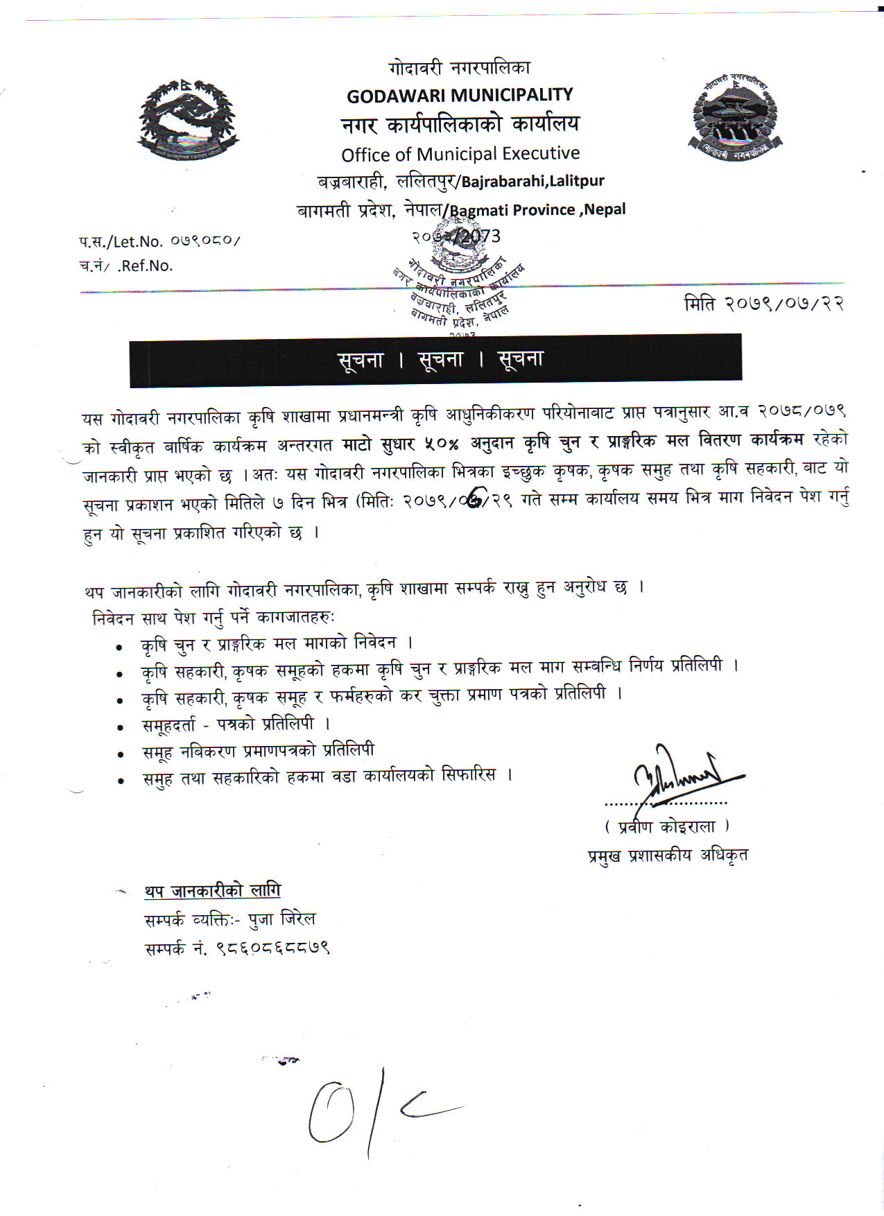 गोदावरी नगरपालिका-११, ललितपुरमा स्थित चापागाउँ तरकारी बजारमा भाडामा लिन सकिने पसल र सार्वजनिक शौचालय निर्माण कार्यका लागि रु ७,८०९,२०५.८३/- रकमको बोलपत्र स्वीकृत गर्ने आशयको सूचना।