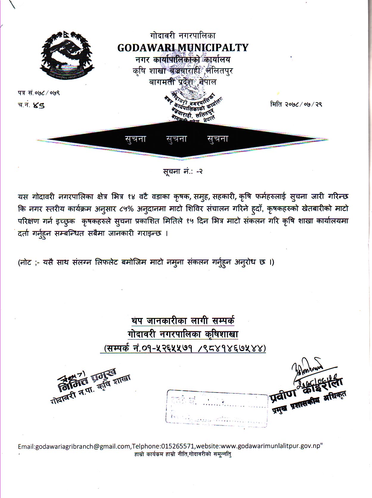 गोदावरी नगरपालिका-११, ललितपुरमा स्थित चापागाउँ तरकारी बजारमा भाडामा लिन सकिने पसल र सार्वजनिक शौचालय निर्माण कार्यका लागि रु ७,८०९,२०५.८३/- रकमको बोलपत्र स्वीकृत गर्ने आशयको सूचना।