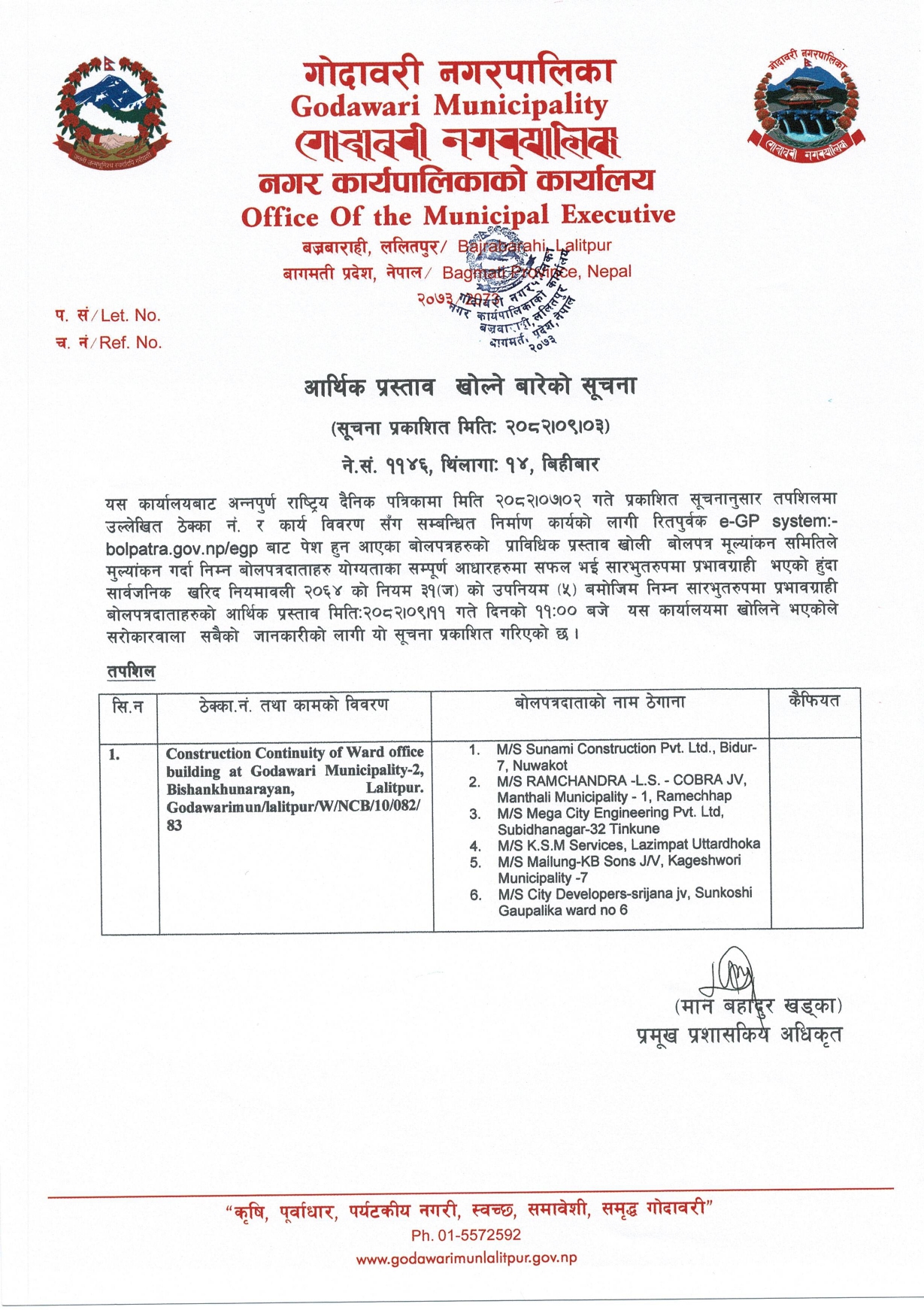 गोदावरी नगरपालिका अन्तर्गत वडा नं २, बिशंखुनारायणस्थित वडा कार्यालय भवन निर्माण कार्यको निरन्तरता सम्बन्धी आर्थिक प्रस्ताव खोल्ने बारेको सूचना।