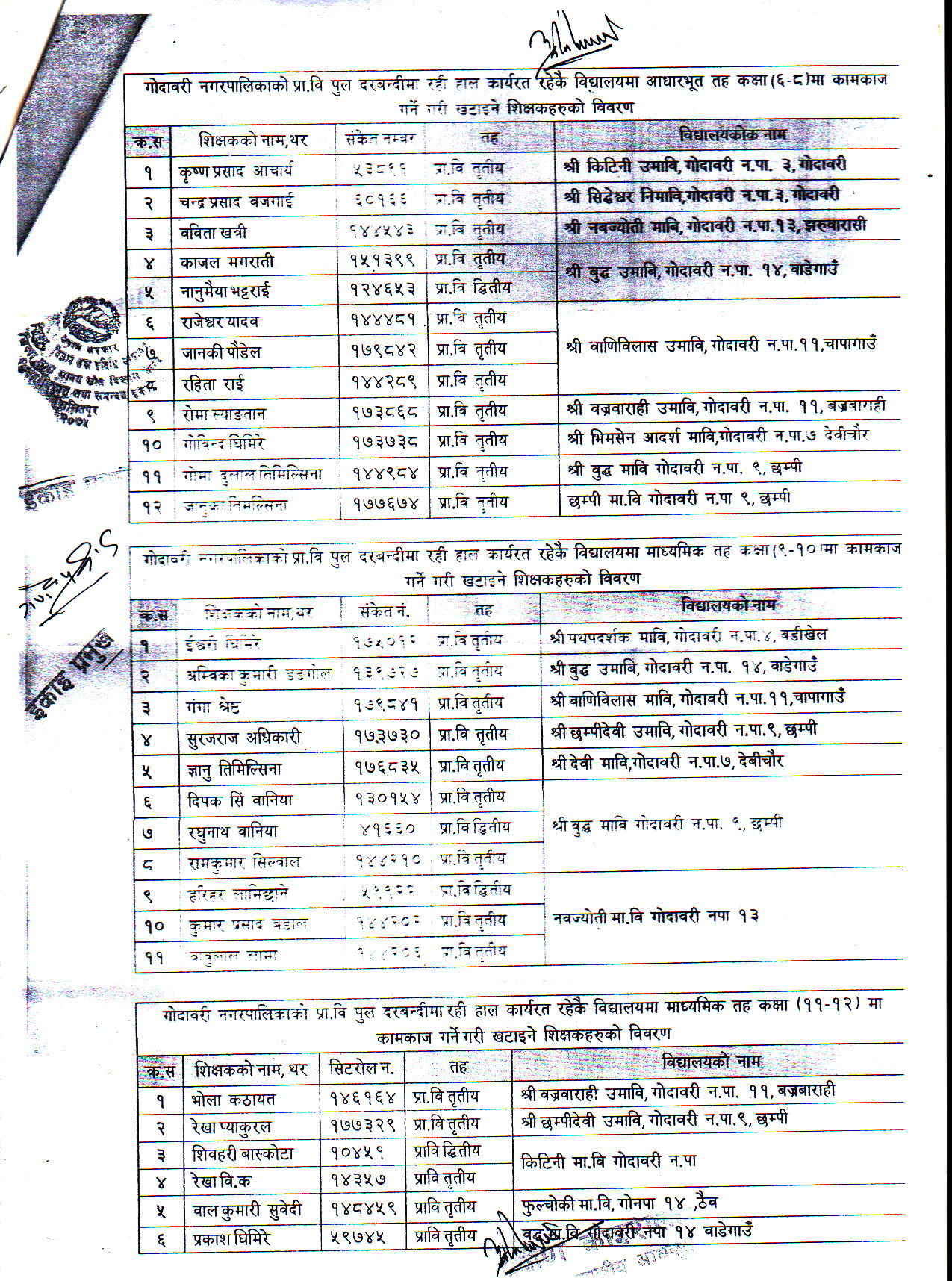 गोदावरी नगरपालिका भित्रका सामुदायिक बिद्यालयहरुमा कार्यरत शिक्षकहरुको सरुवा, पदस्थापना तथा पुल दरबन्दी कायम (दरबन्दी मिलान) सम्बन्धी अत्यन्त जरुरी सूचना