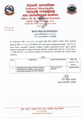 » गोदावरी नगरपालिका वडा नं.०९, ललितपुरस्थित छाँपी खानेपानी आयोजना कार्य सम्बन्धी बोलपत्र स्वीकृत गर्ने आशयको सूचना।