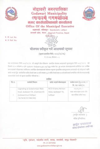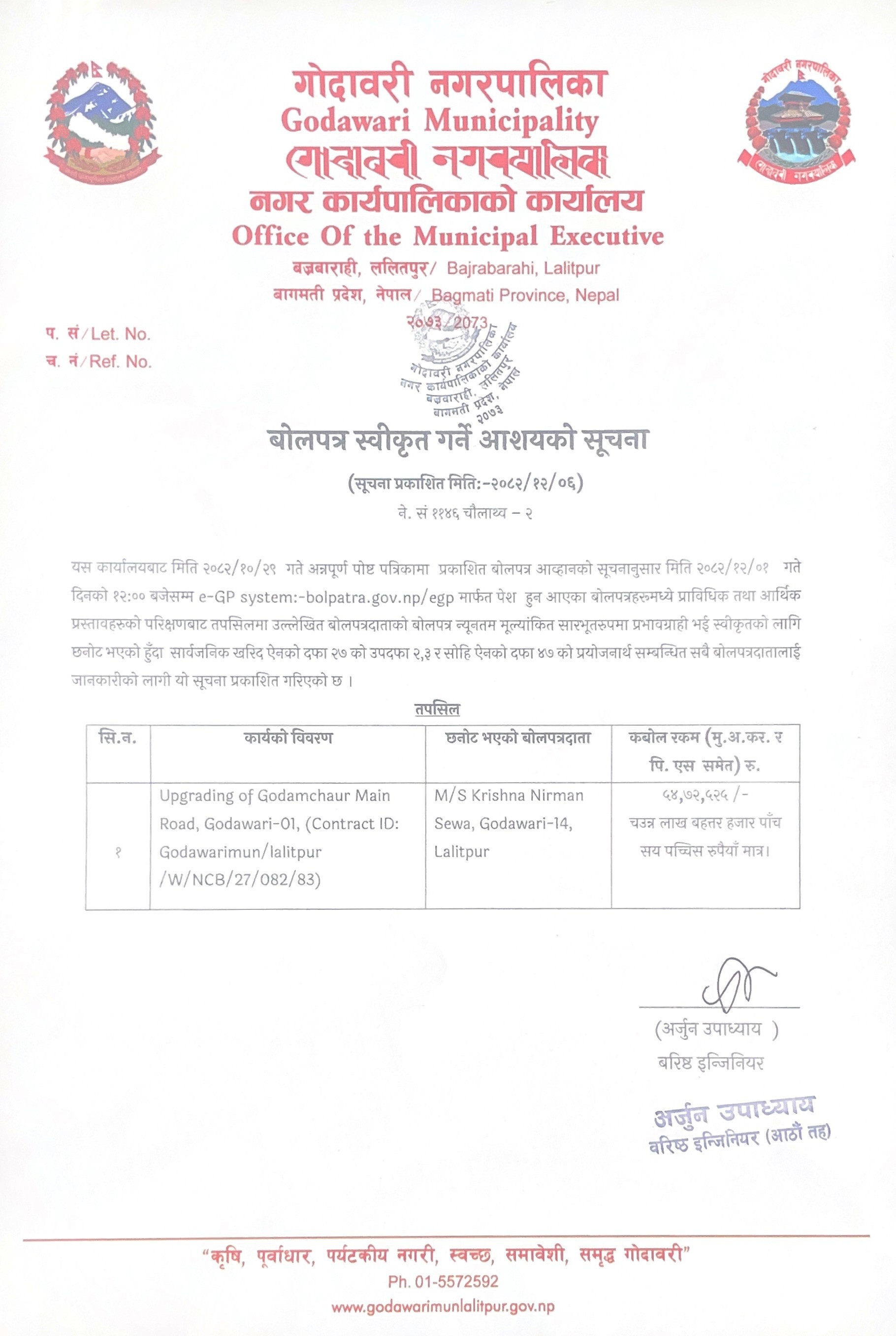 गोदावरी नगरपालिका वडा नं–०१, ललितपुरस्थित गोदामचौर मुख्य सडक स्तरोन्नति आयोजना सम्बन्धि बोलपत्र स्वीकृत गर्ने आशयको सूचना ।