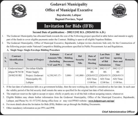गोदावरी नगरपालिका वडा नं–०२, ललितपुरस्थित देविस्थान खाल्डे खानेपानी आयोजना सम्बन्धी बोलपत्र आह्वानको सूचना ।