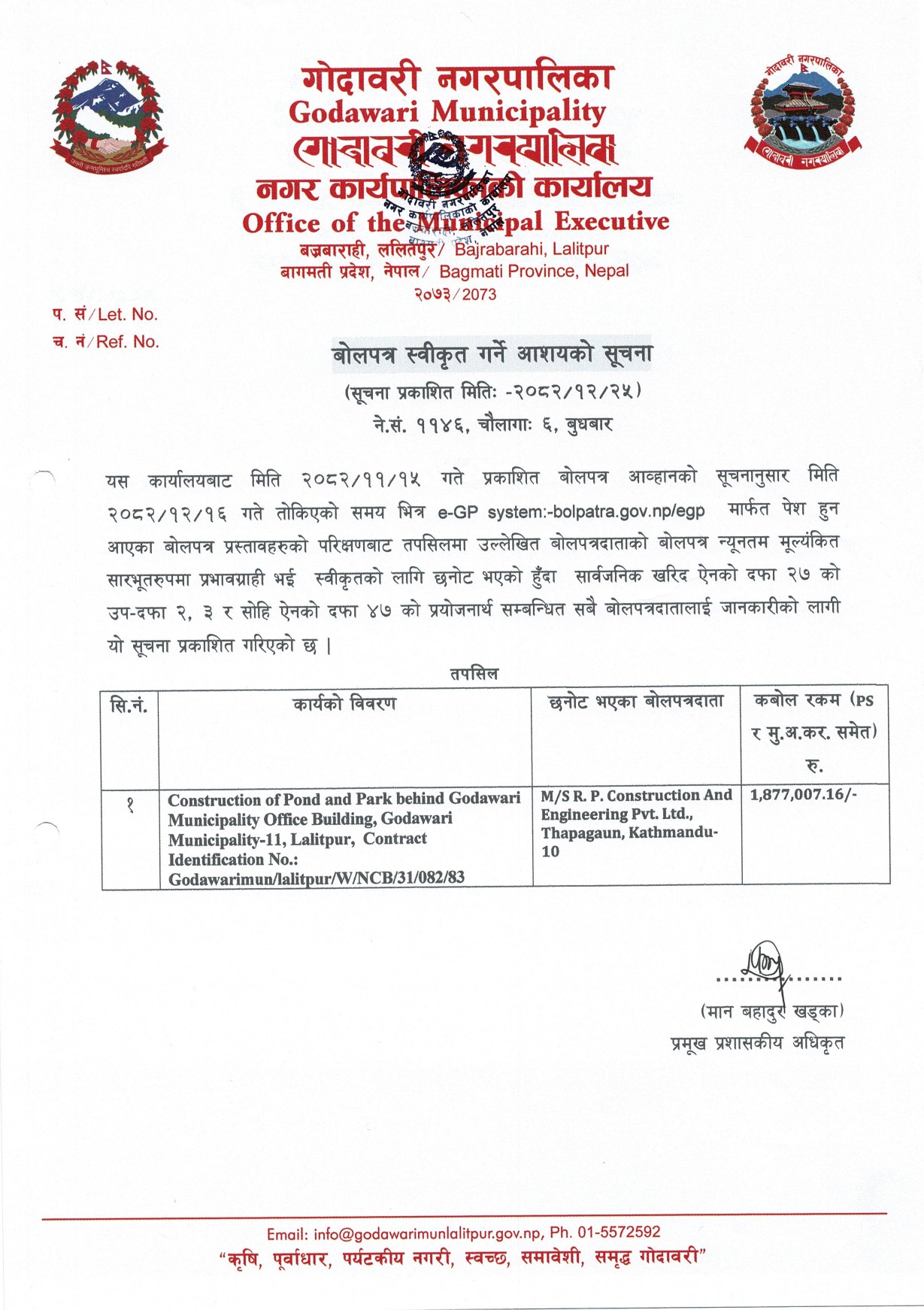 गोदावरी नगरपालिका वडा नं–११, ललितपुरस्थित गोदावरी नगरपालिका कार्यालय भवनको पछाडि पोखरी तथा पार्क निर्माण कार्य सम्बन्धी बोलपत्र स्वीकृत गर्ने आशयको सूचना।