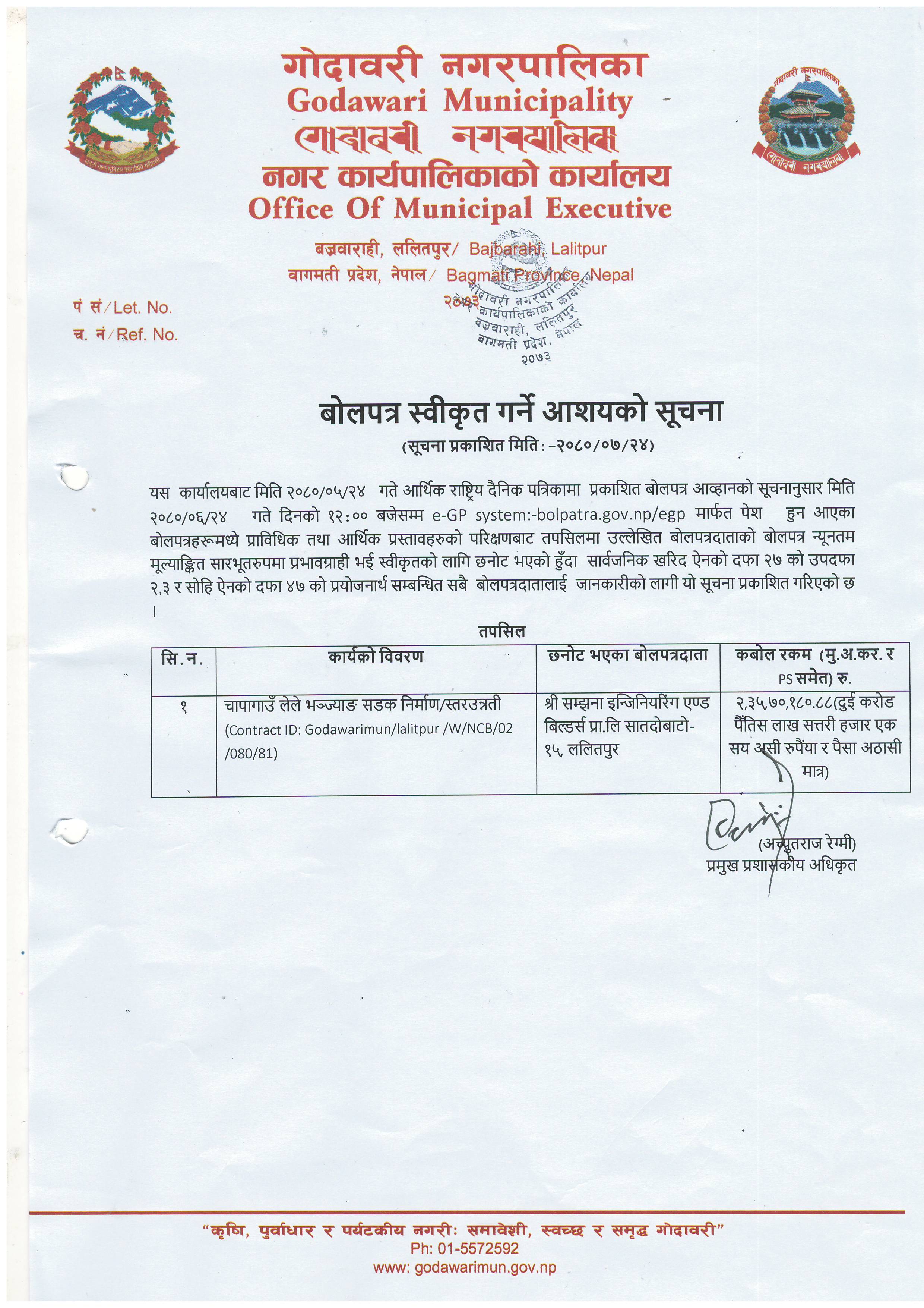 बोलपत्र स्वीकृत गर्ने आश्यको सूचना .