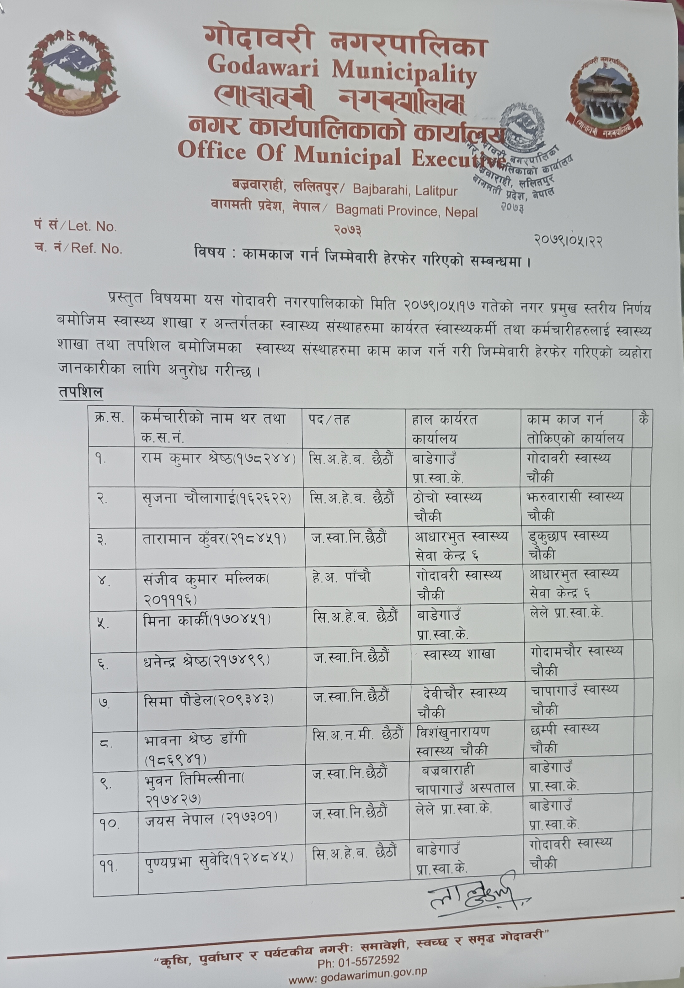 जिम्मेवारी हेरफेर सम्बन्धि (स्वास्थ शाखा)