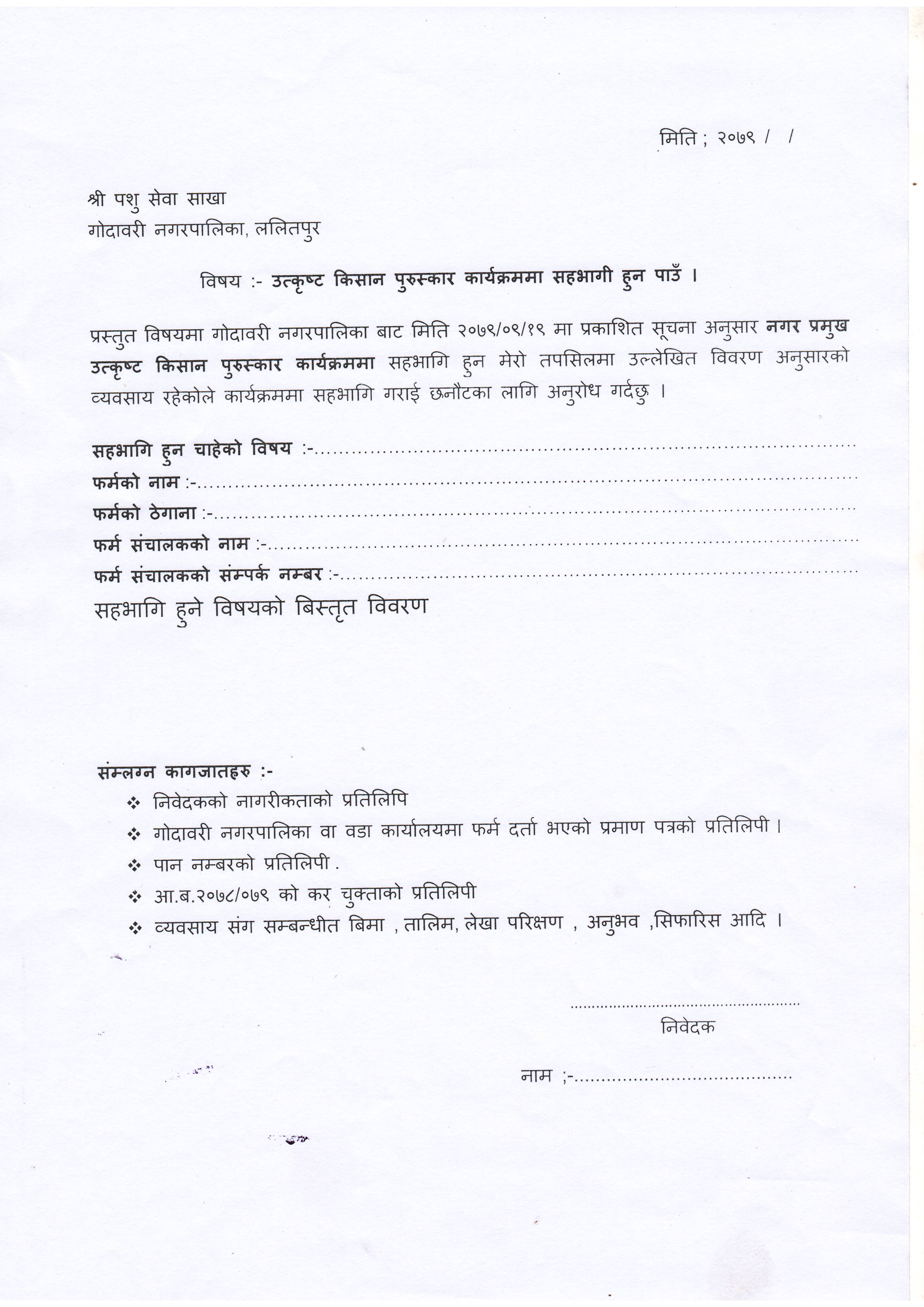 नगर प्रमुख उत्कृष्ट किसान पुरुस्कार कार्यक्रममा सहभागी हुने सूचना
