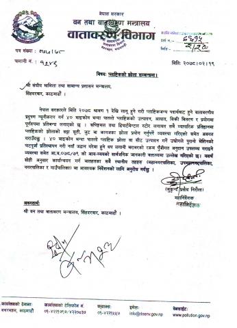 प्लाष्टिक जन्य झोलाको मापदण्ड कार्यान्वयन गर्ने सम्बन्धमा