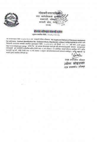 गोदावरी नगरपालिका-११, ललितपुरमा स्थित चापागाउँ तरकारी बजारमा भाडामा लिन सकिने पसल र सार्वजनिक शौचालय निर्माण कार्यका लागि रु ७,८०९,२०५.८३/- रकमको बोलपत्र स्वीकृत गर्ने आशयको सूचना।