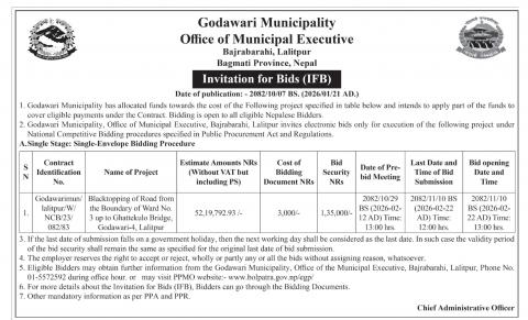 गोदावरी नगरपालिका वडा नं १०, ललितपुर स्थित सल्यान–खसिमारा सडक स्तरोन्नति कार्य सम्बन्धी बोलपत्र स्वीकृत गर्ने आशयको सूचना।