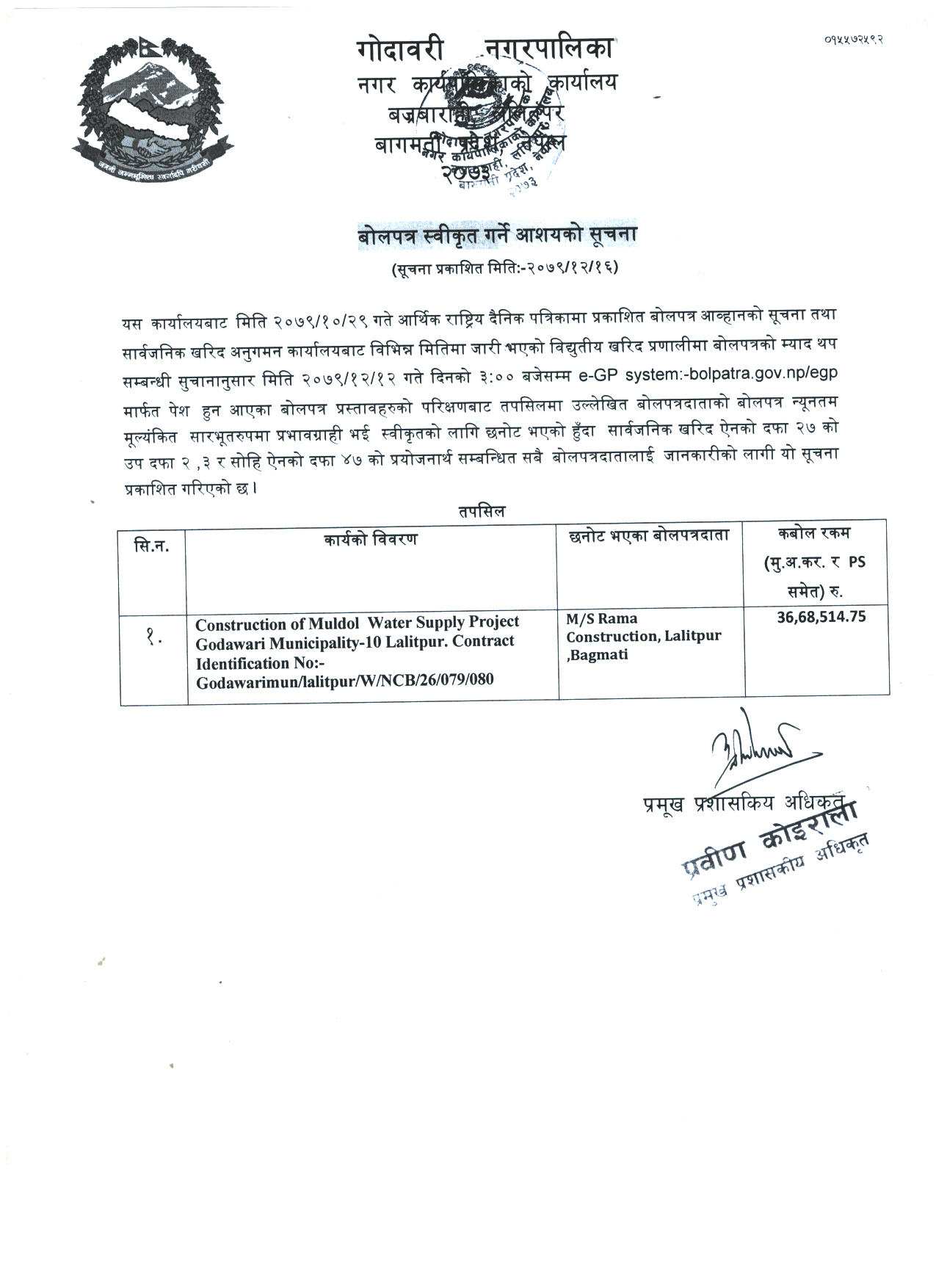 बोलपत्र स्वीकृत गर्ने आश्यको सूचना .
