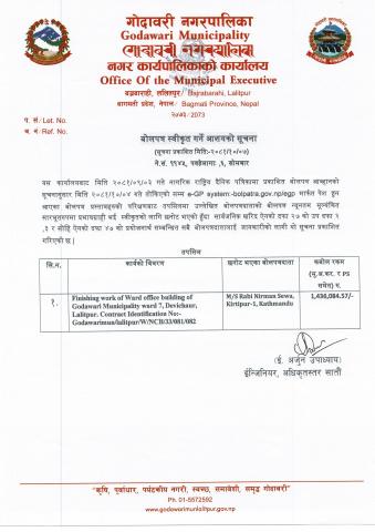 गोदावरी नगरपालिका अन्तर्गत वडा नं २, बिशंखुनारायणस्थित वडा कार्यालय भवन निर्माण कार्यको निरन्तरता सम्बन्धी आर्थिक प्रस्ताव खोल्ने बारेको सूचना।