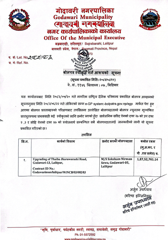 गोदावरी नगरपालिका-११, ललितपुरमा स्थित चापागाउँ तरकारी बजारमा भाडामा लिन सकिने पसल र सार्वजनिक शौचालय निर्माण कार्यका लागि रु ७,८०९,२०५.८३/- रकमको बोलपत्र स्वीकृत गर्ने आशयको सूचना।