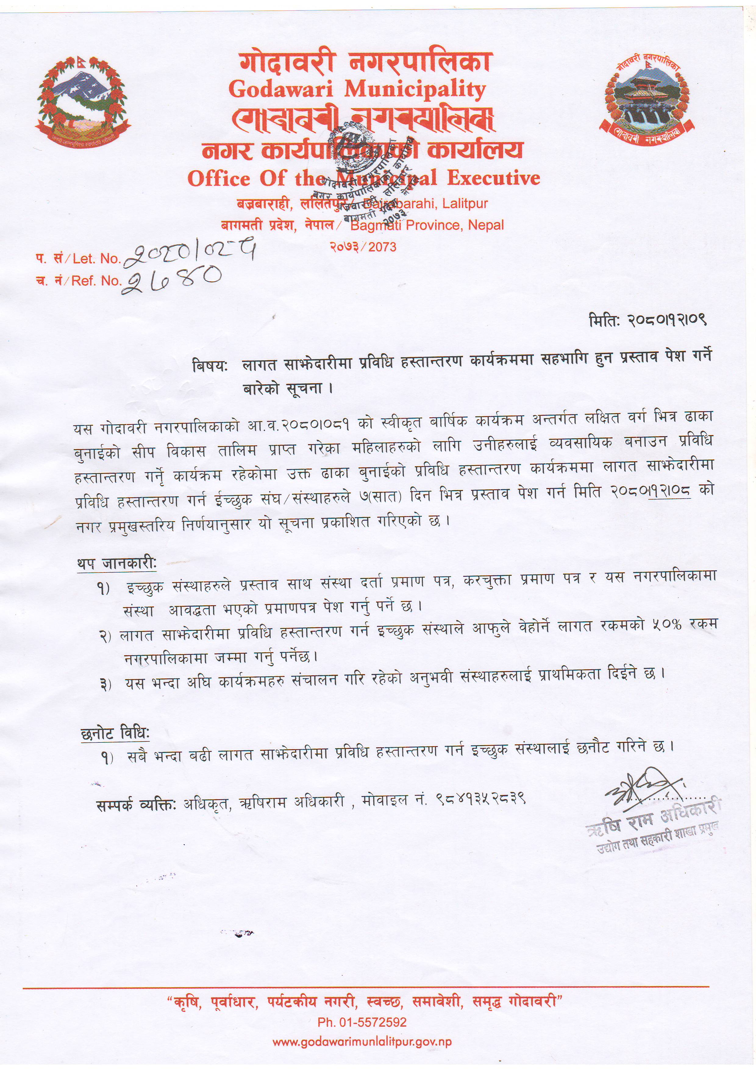 गोदावरी नगरपालिका अन्तर्गत वडा नं. १२, ठेचोस्थित गोदावरी नगरपालिका अस्पतालको ब्लक–बी भवन निर्माण सम्बन्धी आर्थिक प्रस्ताव खोल्ने बारे सूचना।