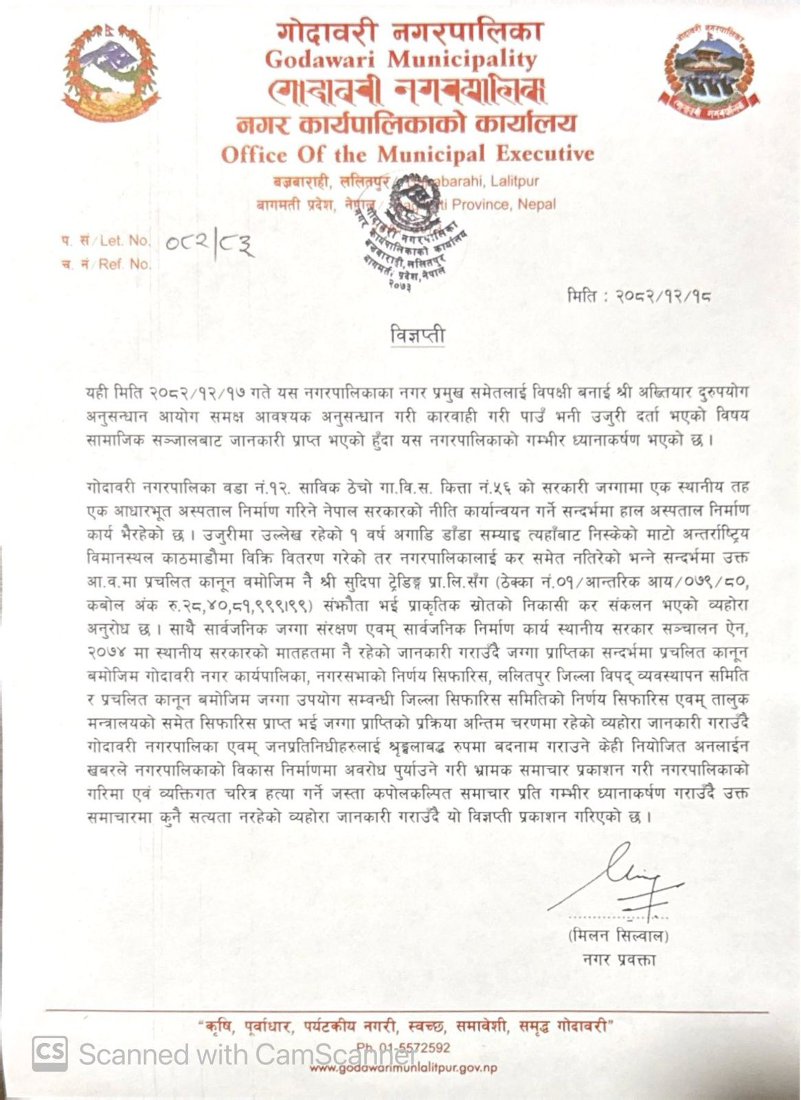 गोदावरी नगरपालिका वडा नं–०२, ललितपुरस्थित देविस्थान खाल्डे खानेपानी आयोजना सम्बन्धी बोलपत्र आह्वानको सूचना ।