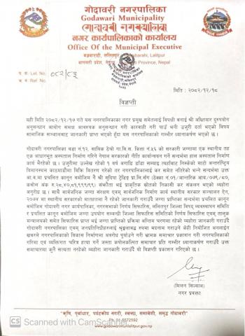 गोदावरी नगरपालिका वडा नं–०२, ललितपुरस्थित देवस्थान–खाल्डे खानेपानी आयोजना सम्बन्धि बोलपत्र आह्वानको सूचना ।