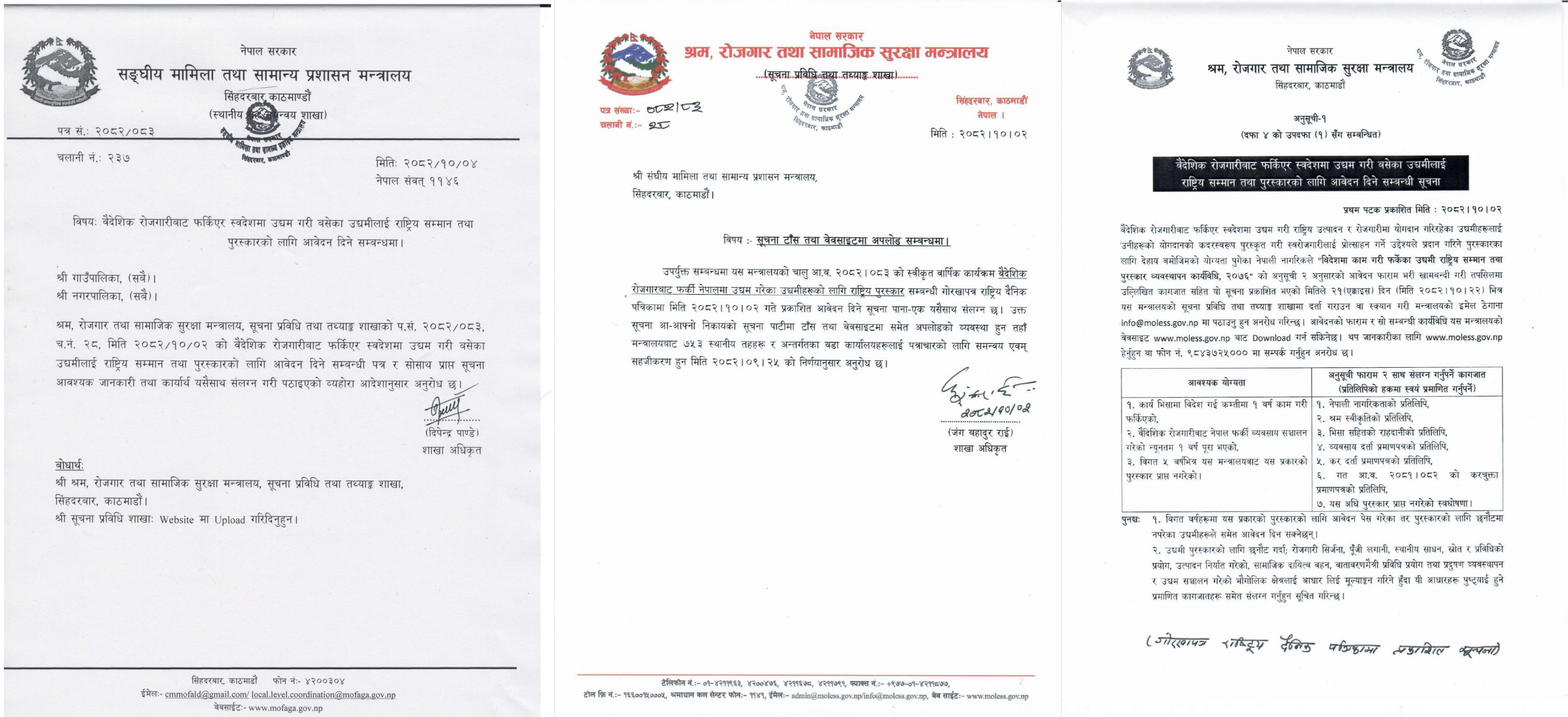 वैदेशिक रोजगारीबाट फर्किएर स्वदेशमा उद्यम गरी बसेका उद्यमीलाई राष्ट्रिय सम्मान तथा पुरस्कारको लागि आवेदन दिने सम्बन्धमा।