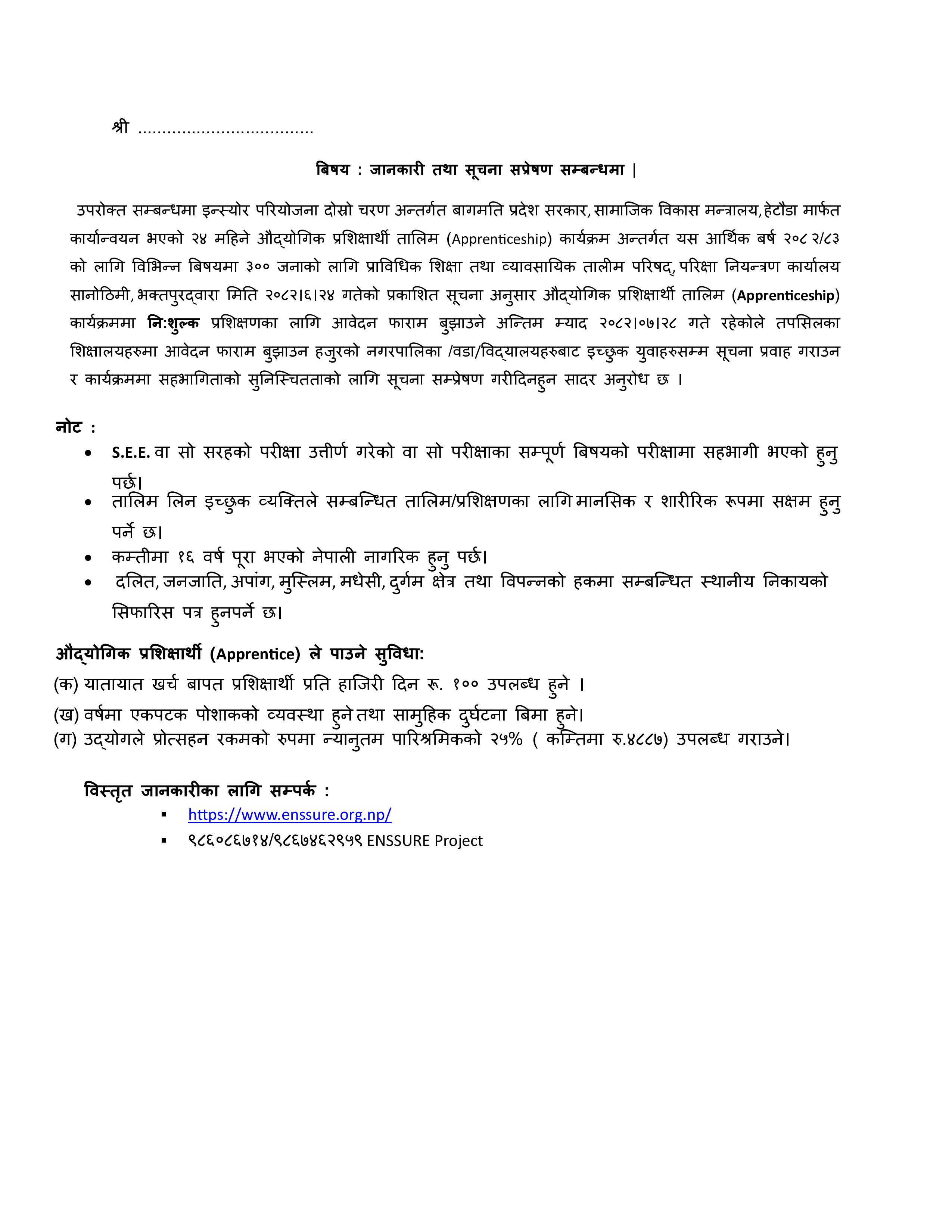 सामाजिक विकास मन्त्रालयबाट प्रकाशित औद्योगिक प्रशिक्षार्थी तालिम सम्बन्धी सूचना सम्प्रेषण सम्बन्धमा ।
