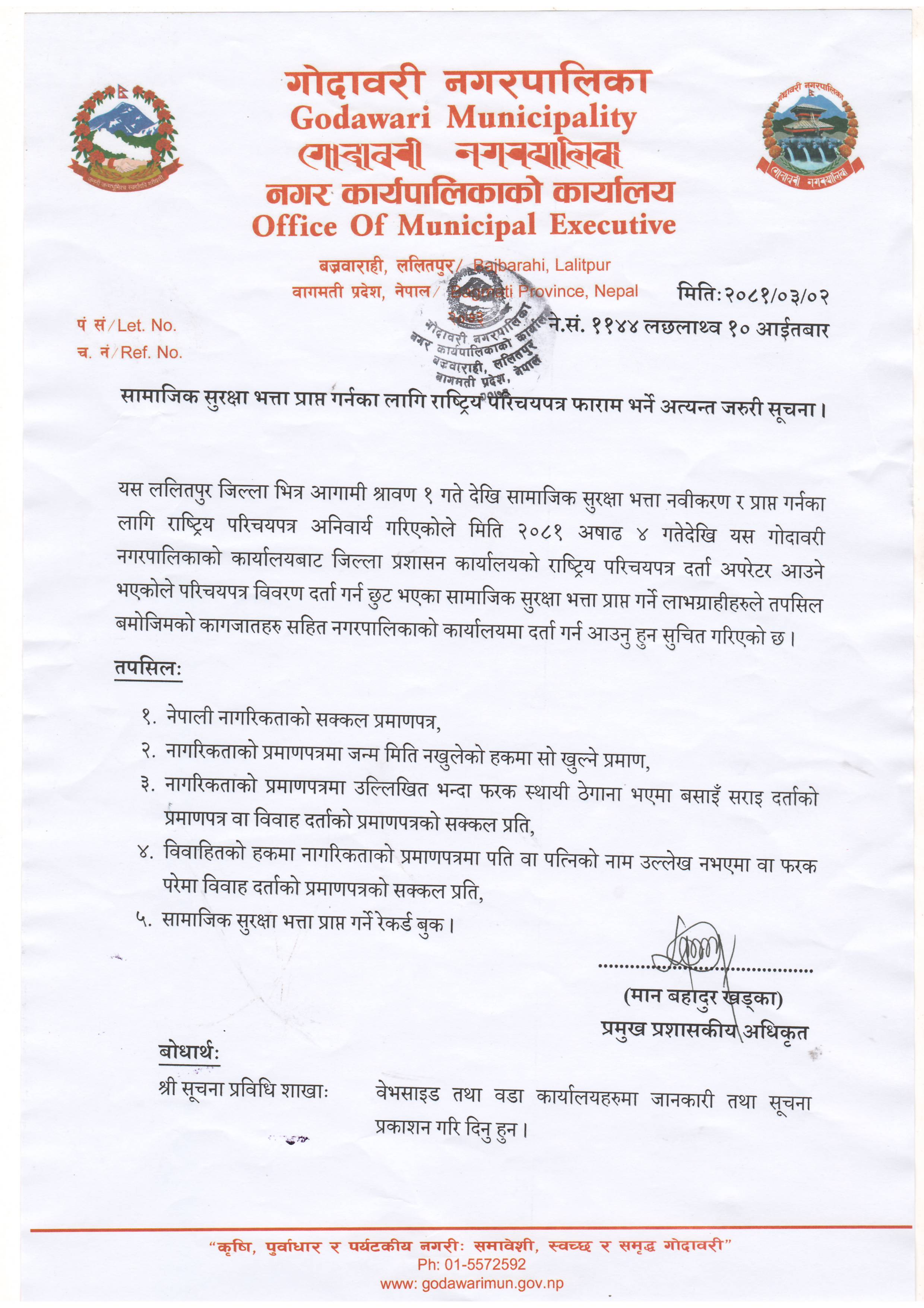 सामाजिक सुरक्षा भत्ता प्राप्त गर्नका लागि राष्ट्रिय परिचयपत्र फारम भर्ने अत्यन्त जरुरी सूचना।
