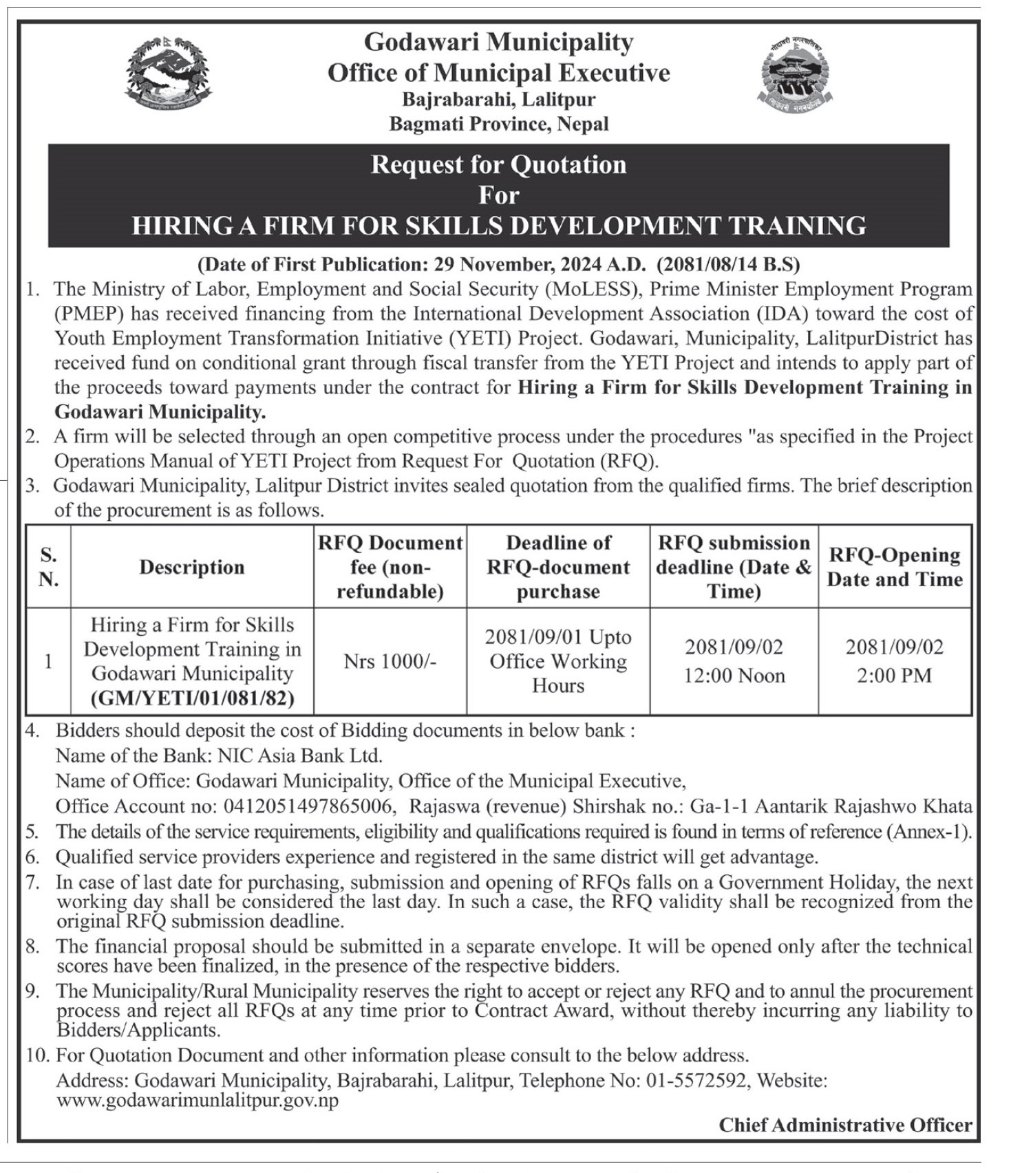 सूचीकृत बेरोजगारहरुको लागि कार्यस्थलमा आधारित सीप तालिमको लागि सेवा प्रदायकहरुलाई Request for Quotation (RFQ) सम्बन्धी सूचना ।