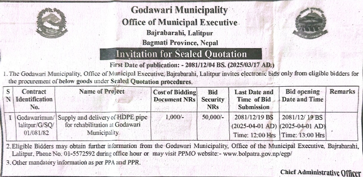 गोदावरी नगरपालिका-११, ललितपुरमा स्थित चापागाउँ तरकारी बजारमा भाडामा लिन सकिने पसल र सार्वजनिक शौचालय निर्माण कार्यका लागि रु ७,८०९,२०५.८३/- रकमको बोलपत्र स्वीकृत गर्ने आशयको सूचना।